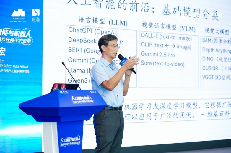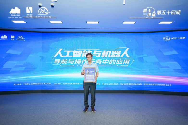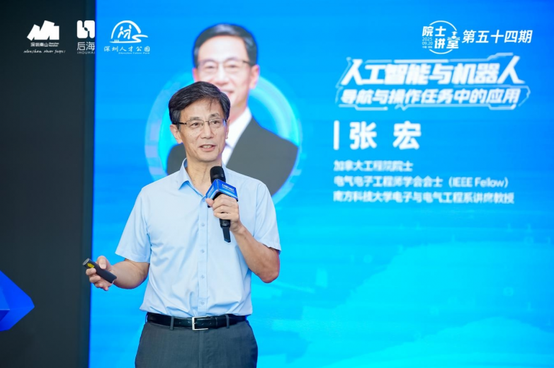 在战略性新兴产业与未来产业交织发展的时代背景下,人工智能与机器人技术已成为推动社会进步的重要引擎。9月20日,第五十四期院士讲堂在深圳人才公园求贤阁开讲,加拿大工程院院士、南方科技大学电子与电气工程系讲席教授张宏院士带来了《人工智能与机器人——导航与操作任务中的应用》的精彩演讲,吸引了来自人工智能、机器人等领域的专家学者、高层次人才、企业代表以及市民朋友共200余人参与。本次活动由南山区委组织部(区人才工作局)主办,华润置地城市运营管理(深圳)有限公司承办,南山区工业和信息化局、南山区城市管理和综合执法局、深圳高科技企业协同创新促进会等单位协办。