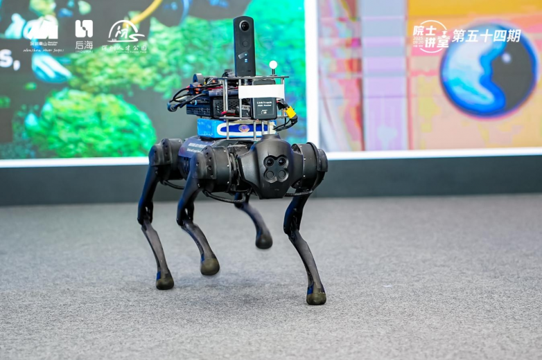 张宏院士在演讲中指出:“我们的核心目的就是利用人工智能领域开发的技术,帮助机器人获得在开放世界中工作的能力,让机器人进入日常生活。”他结合自身研究经历与团队在深圳市机器人视觉与导航重点实验室的成果,阐释了多项相关研究,包括与企业合作研发外卖配送机器人以解决最后几百米配送问题,以及开发四足机器狗的视觉行人跟随技术——该技术还在现场进行了演示。